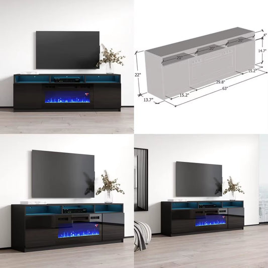 Modern Electric Fireplace TV Stand with High Gloss Finish and Storage Cabinets - 63 Inch Entertainment Center for Living Room