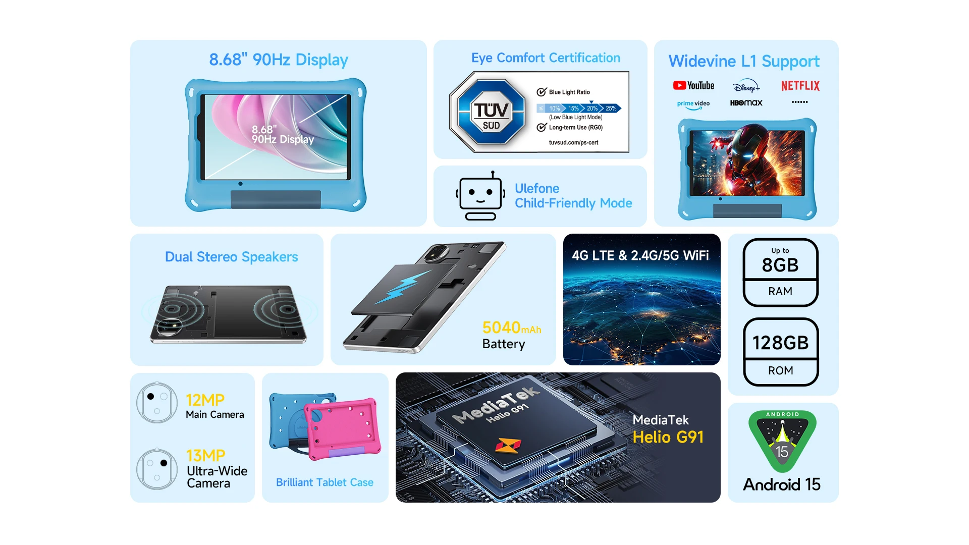【2025 New】 Tab A9 Pro Kids 4G Tablet Android 15 RAM(8+8) 128GB ROM 5040Mah 8.68" Display Child-Friendly TÜV Eye-Comfort