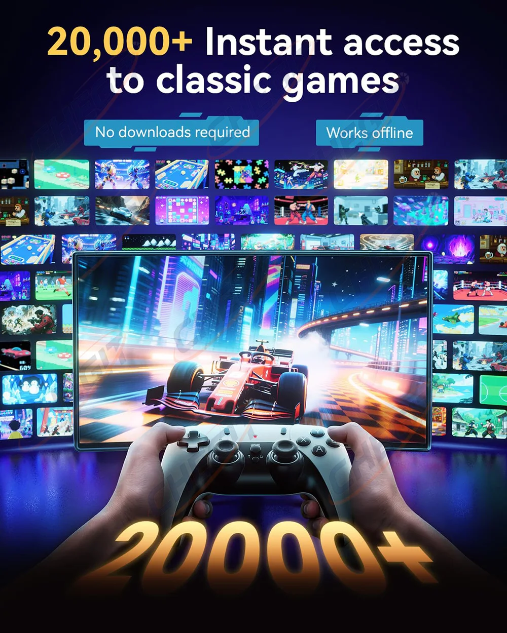 The console comes with over 20,000+ built-in games and 23 pre-installed emulators, offering a vast selection of classic games without the need for additional downloads or an internet connection. Press SELECT and START simultaneously to return to the main menu.