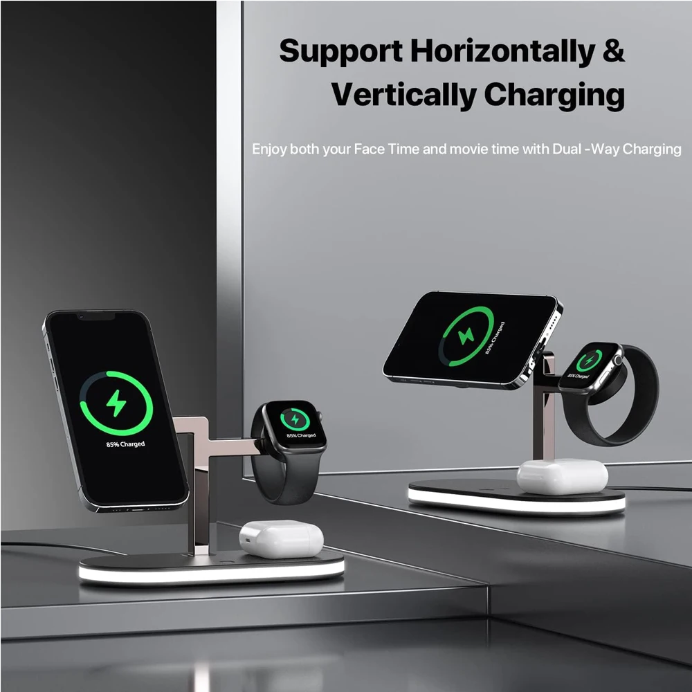 3 【Snap and Go】4 in 1 wireless charging station through powerful magnetic connection and easy alignment, charge your iPhone15 14 13/12 series more efficiently for an uninterrupted charging experience. Non-slip design, strong magnetic force can securely props up your phone and prevent it from falling. Charge vertically or horizontally, you can watch movie, video chat and keep tabs on messag, etc.