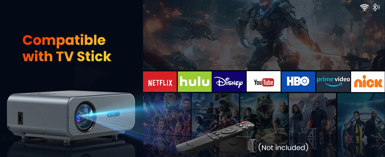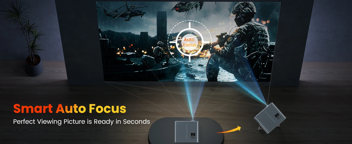 [Smarter - Auto Focus, 6D Keystone] The projector achieve 4P/6D function (4-point,±50°horizontal and vertical, rotational directions adjustment) by CMOS camera, which helps projector to detect the movement and automatically adjust to a correct image. No matter how you place wifi bluetooth projector, you will get your suitable image within 3 seconds. One-click reset function makes it more user-friendly, more intelligent than other projectors