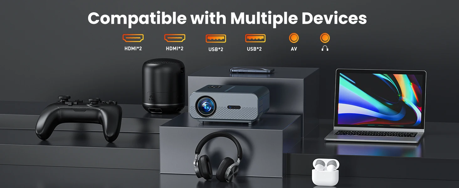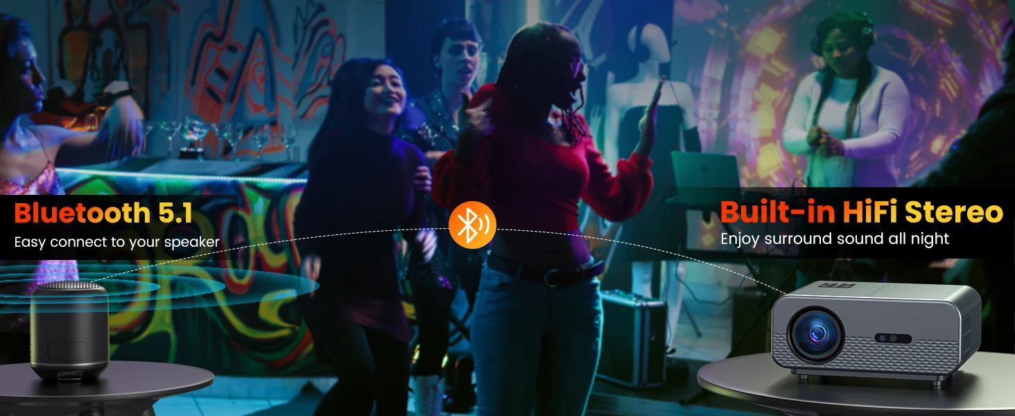 [Louder - Bluetooth 5.1, 2X Stereo Speakers] The bluetooth projector built-in 5W dual stereo speakers and SRS sound system, provides powerful, clear and dynamic audio that could enhance your viewing experience especially for games, family movie night or outdoor party. With Bluetooth connectivity, you can easily connect the 1080P projector to bluetooth speakers, soundbar, headphone, or other audio equipment without the hassle of cords and wires