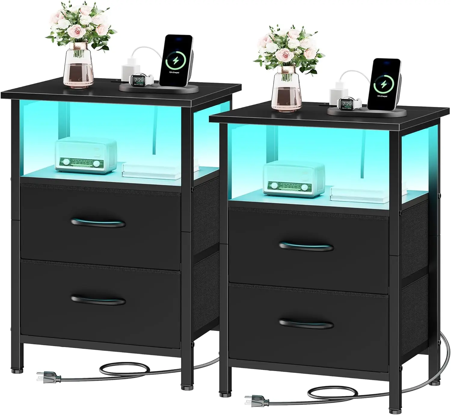 2-Piece Nightstand Set with LED Lights & Charging Station, 2 Fabric Drawers & Storage Shelves, Black Bedside Tables for Bedroom