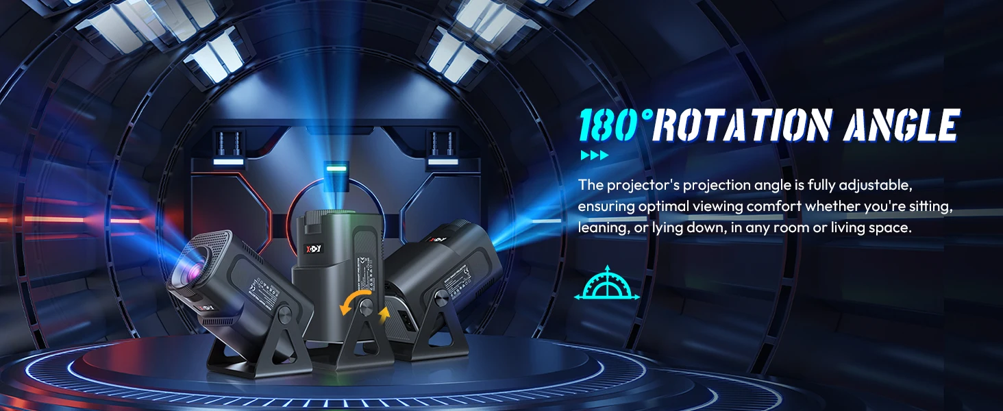 Powered by the latest Android OS, this projector supports downloading and running your favorite apps directly, eliminating the need for external devices. With a 180° rotatable stand, you can project to various angles, including onto the ceiling, providing a comfortable viewing experience from any position, even while lying in bed.