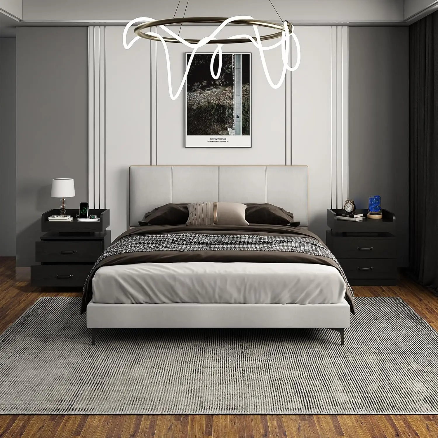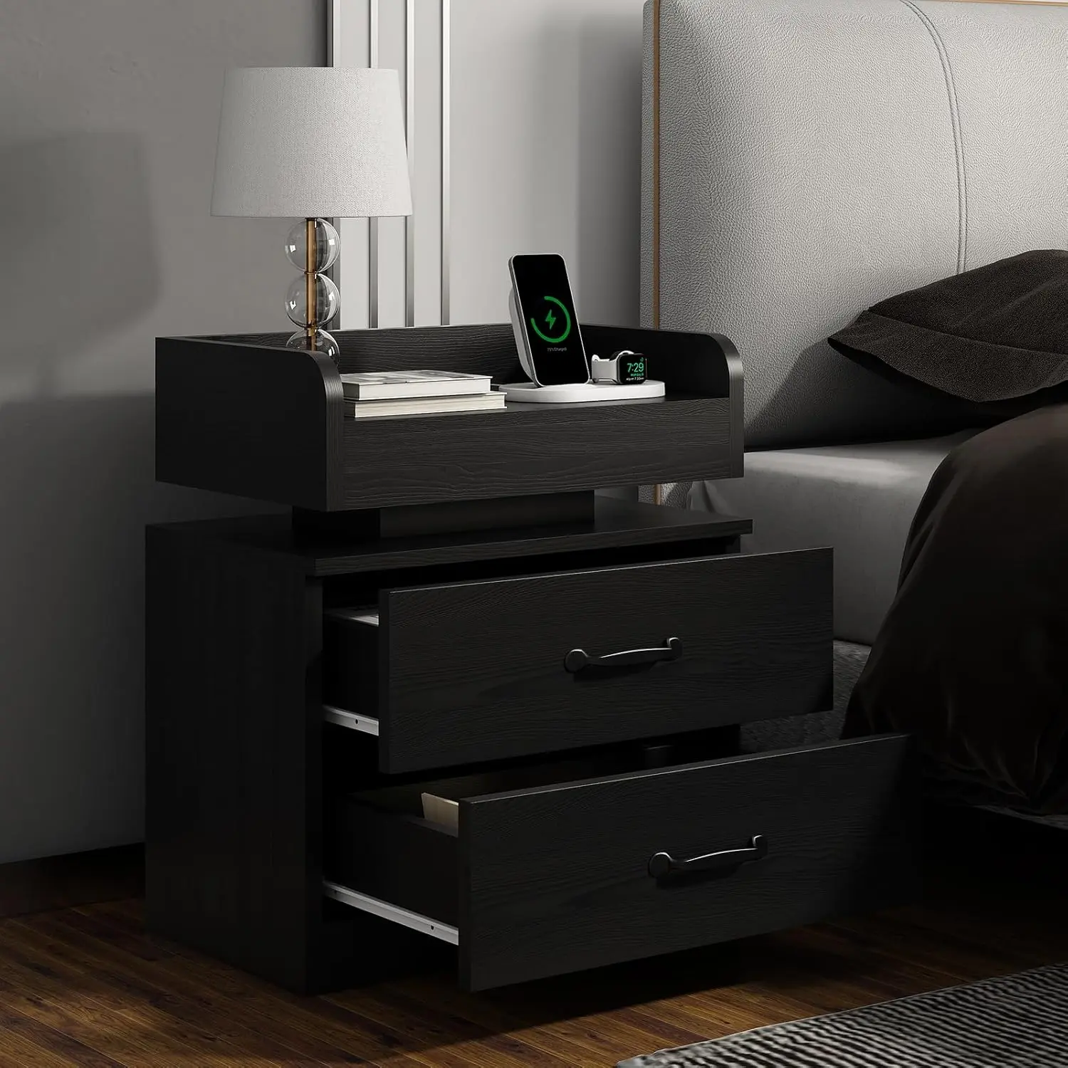 Black Nightstand with Charging Station, Bedside Table for Bedroom, LED Nightstand, Modern Night Stand with Drawers,, Customized