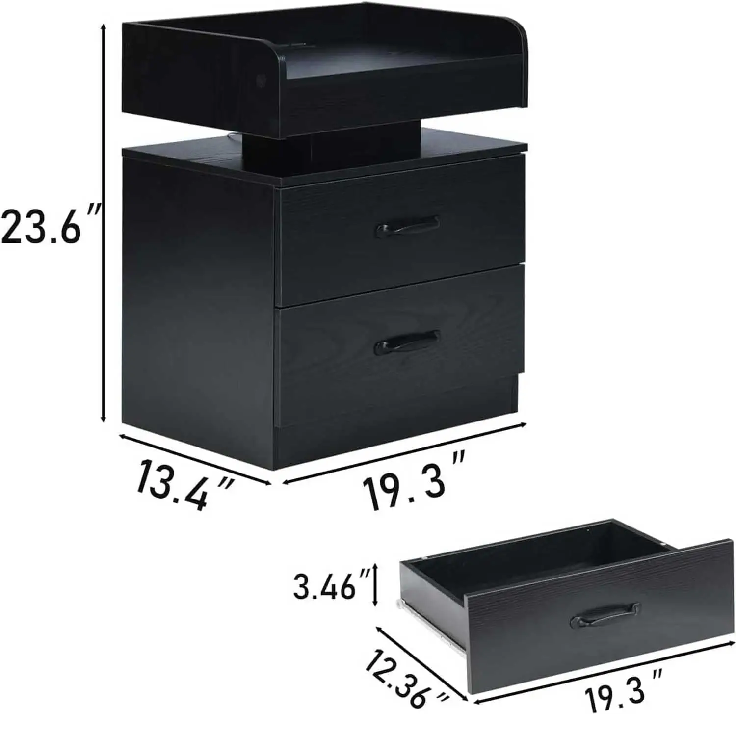 [LED Night Stand with 2 Large Drawers]: LED night stand size 23.6’’H x 13.4’’D x 19.3’’W. The combination of 2 storage drawers and tabletop storage gives this black nightstand amazing large storage capacity. The practical design of 2 drawers can meet your daily storage needs and keep your room organized. The suspended space in the middle also brings some storage and display functions