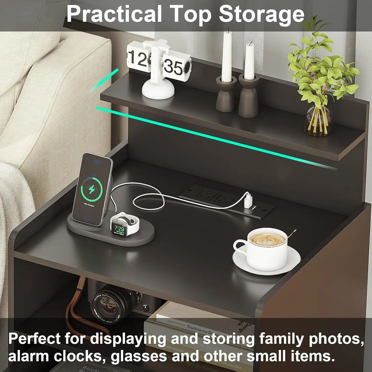 【Multi-Color RGB LED Lighting with Smart APP Control】Transform your bedroom or living room ambiance with this innovative nightstand featuring vibrant RGB LED lights. Control millions of colors, brightness levels, and lighting effects directly from your smartphone via the dedicated mobile app. Choose from various modes including timing functions for automated lighting schedules, dynamic style modes for visual appeal, music sync modes that pulse to your favorite tunes, and microphone-activated modes that respond to ambient sound. Create the perfect atmosphere for relaxation, entertainment, or productivity with customizable light shows at your fingertips. 【Convenient Charging Station for All Your Devices】Stay powered up effortlessly with the integrated charging hub on this nightstand. Equipped with 2 standard AC outlets and 2 high-speed USB ports, you can simultaneously charge multiple devices such as smartphones, tablets, lamps, e-readers, and more. The generous 4.9-foot power cord provides flexibility in placement, allowing you to position the table conveniently near beds or sofas without being limited by outlet locations. Enjoy clutter-free charging and easy access to power whenever you need it. 【Ample Storage Solutions for Organization】Maximize space efficiency with this thoughtfully designed nightstand offering five distinct storage areas. The top shelf is ideal for displaying decorative items like photo frames, plants, or books. The spacious tabletop provides a convenient surface for daily essentials such as alarm clocks, glasses, or beverages. Two enclosed drawers offer secure storage for personal belongings like jewelry, medications, or documents that require privacy. An additional open compartment allows quick access to frequently used items like remote controls or magazines. This vertical design optimizes corner spaces in bedrooms or living rooms while keeping everything tidy and within reach. 【Durable Construction & Easy Maintenance】Built to last with premium materials ensuring stability and longevity: Dimensions: 15.7 inches deep x 17.7 inches wide x 28.7 inches high (40cm D x 45cm W x 73cm H). The sturdy particle board frame provides robust support for both the table itself and items placed on it. Smooth-operating metal drawer slides and handles ensure quiet and reliable opening/closing motions every time you use them! A waterproof surface treatment protects against spills making cleaning simple—just wipe down with a damp cloth when needed! Its sleek black finish complements modern decor styles seamlessly blending into any room setting whether used as a bedside table in bedrooms or an end table beside sofas in living areas! 【Simple Assembly Process & Reliable Support】Get started quickly thanks to clear step-by-step instructions included along all labeled parts/accessories required assembly process straightforward even beginners can complete within minutes using basic tools provided! Should any issues arise during setup usage our customer service team ready assist promptly offering replacement components free charge if necessary ensuring satisfaction throughout ownership experience!